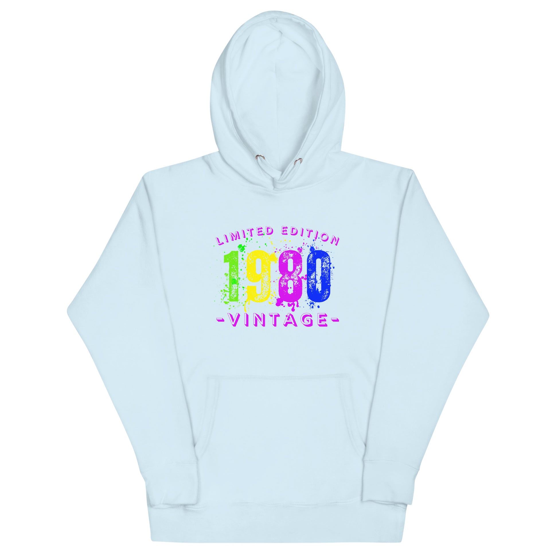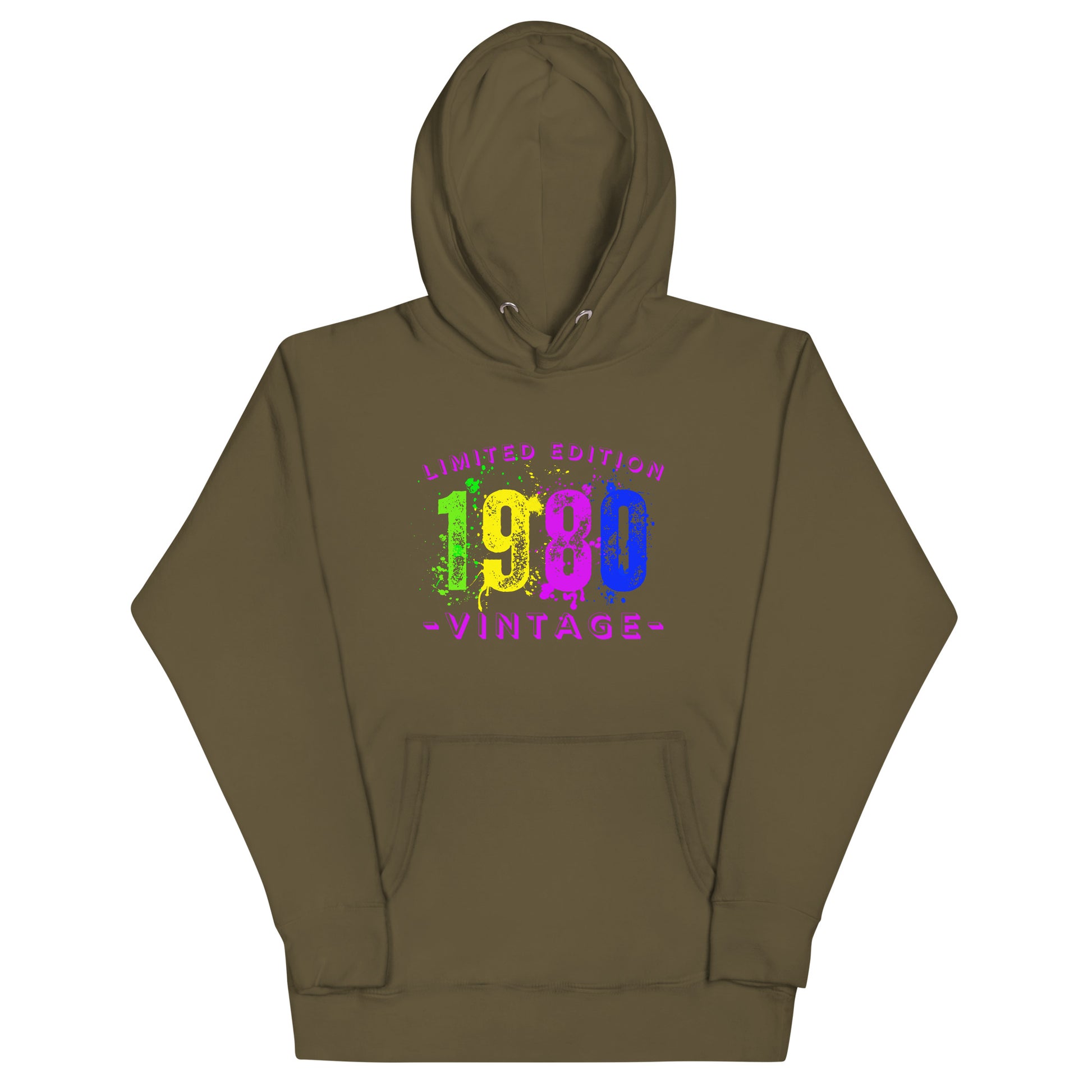 1980 Vintage Unisex Hoodie Sweatshirt: A nod to nostalgia. Dive into the retro vibes with this classic year-printed shirt. Perfect for those who cherish memories or celebrate a '80 milestone. Timelessly stylish!