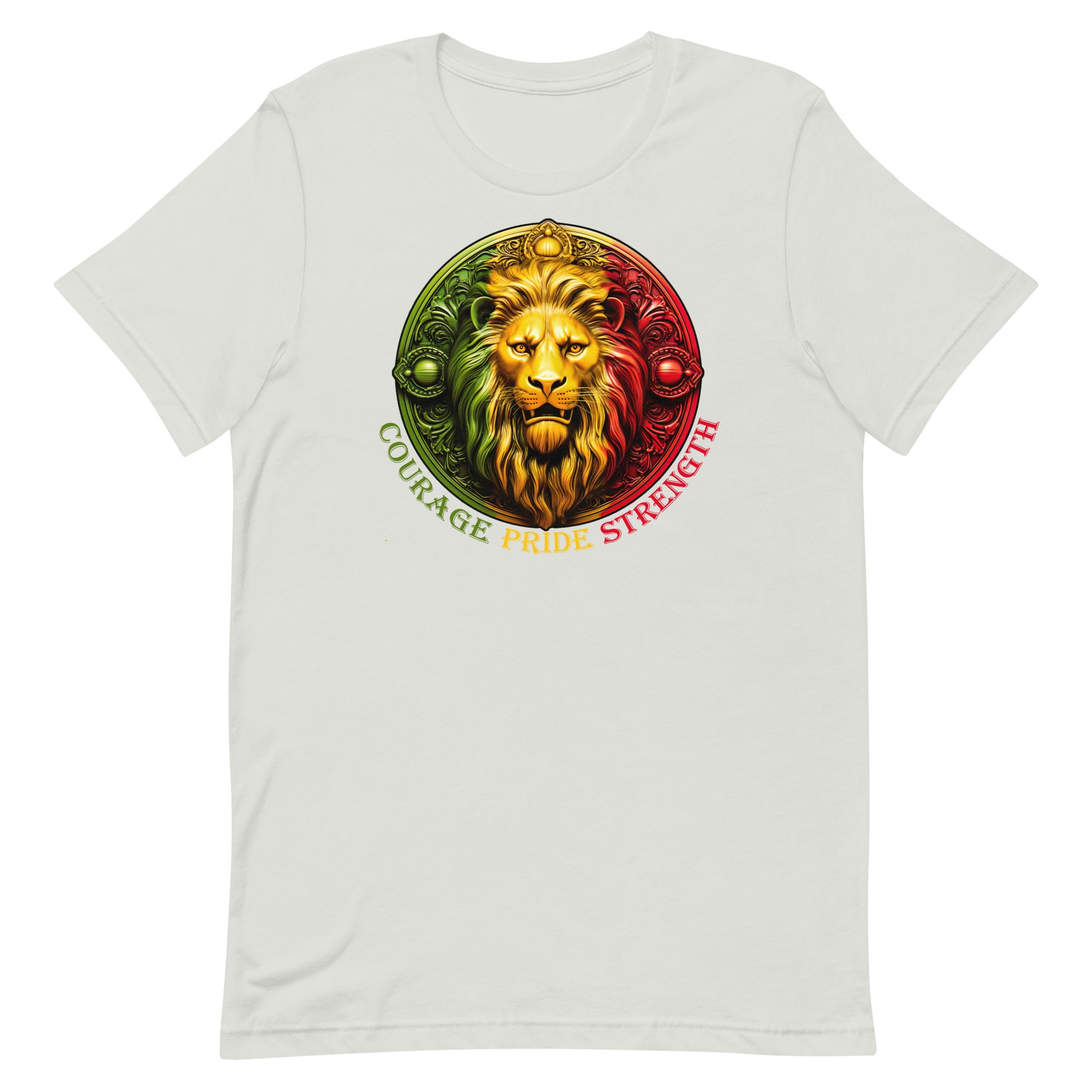 Lion Crest. Courage, Pride, Strength. Unisex T-shirt. Embody the regal essence with this vibrant red, gold, and green Lion crest design. Flaunting the lion's majesty and the words 'Courage, Pride, Strength,' it's more than a shirt; it's a declaration of inner fortitude. Wear it and conquer your world.
